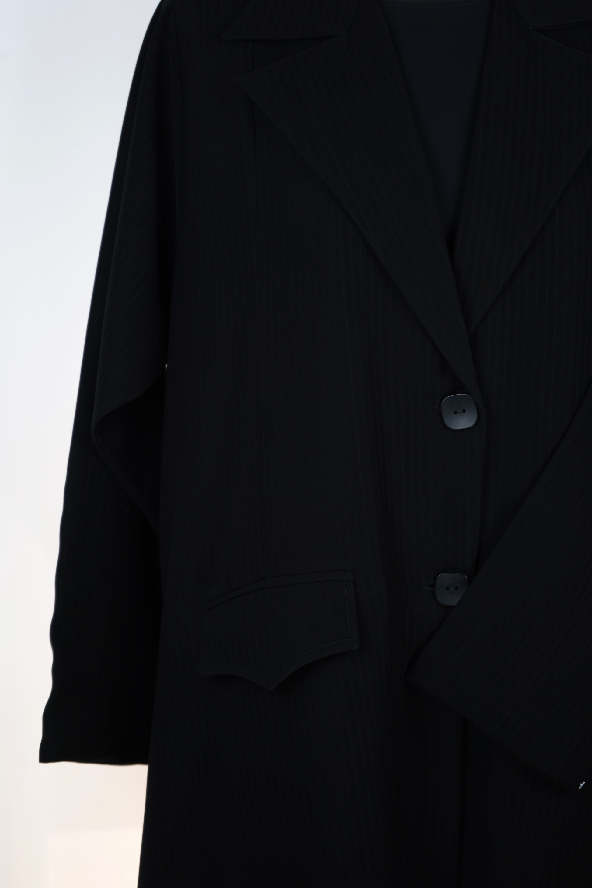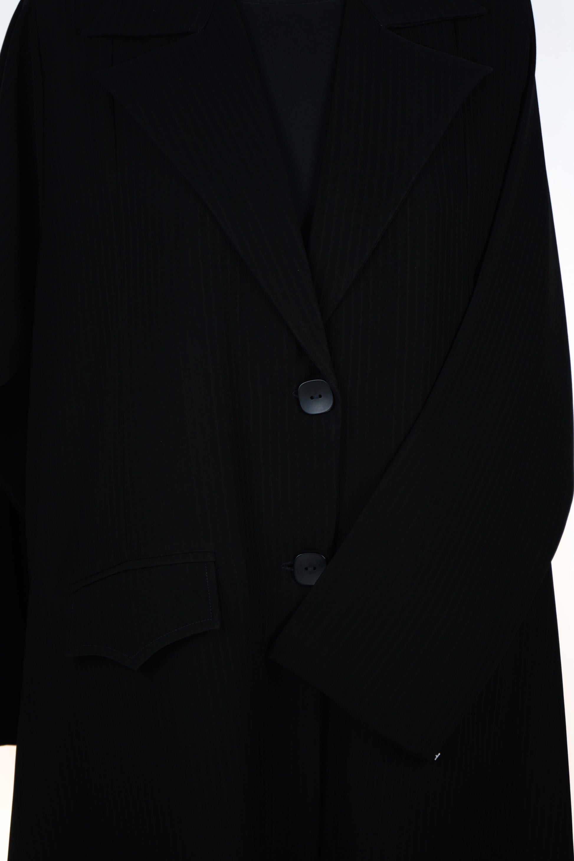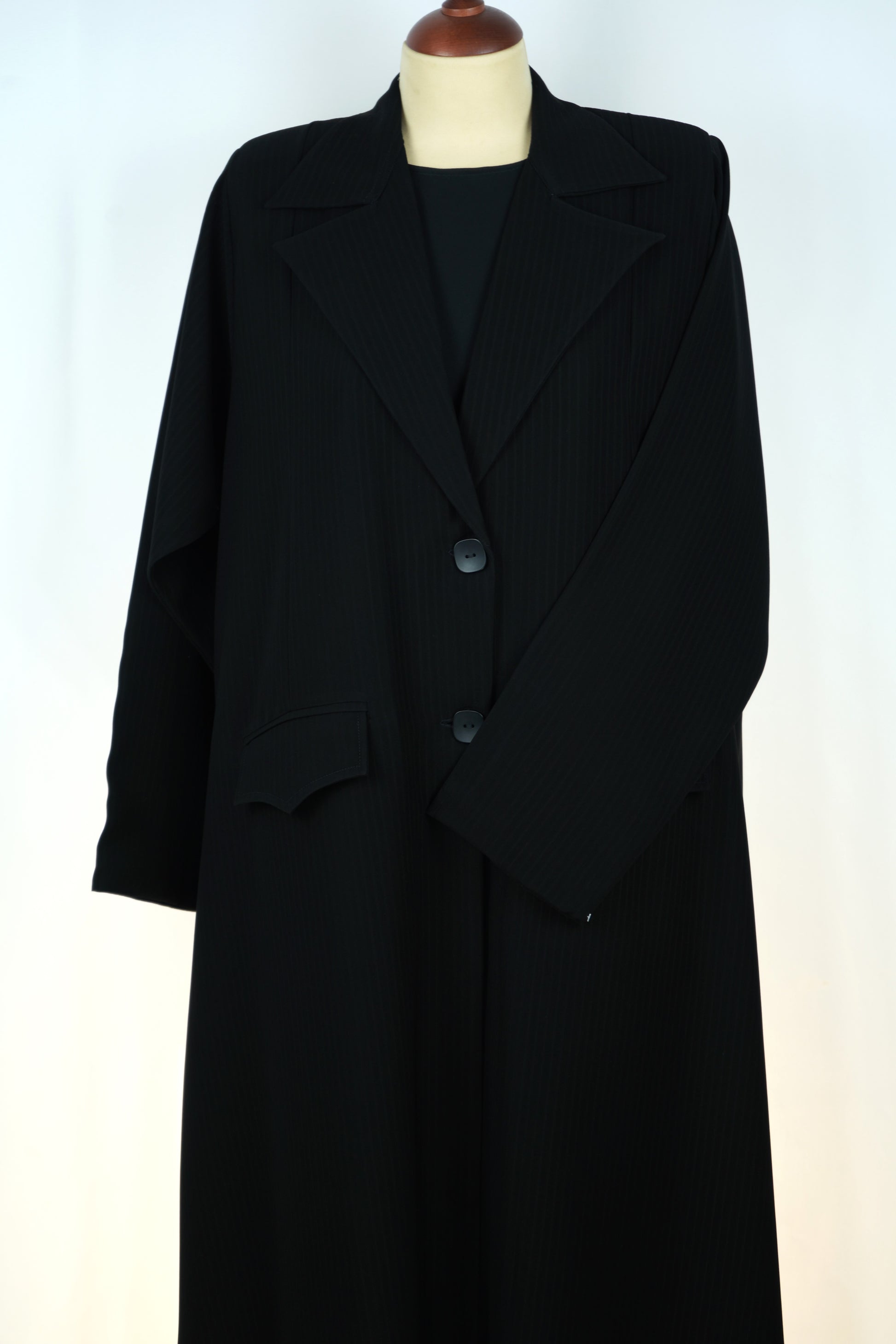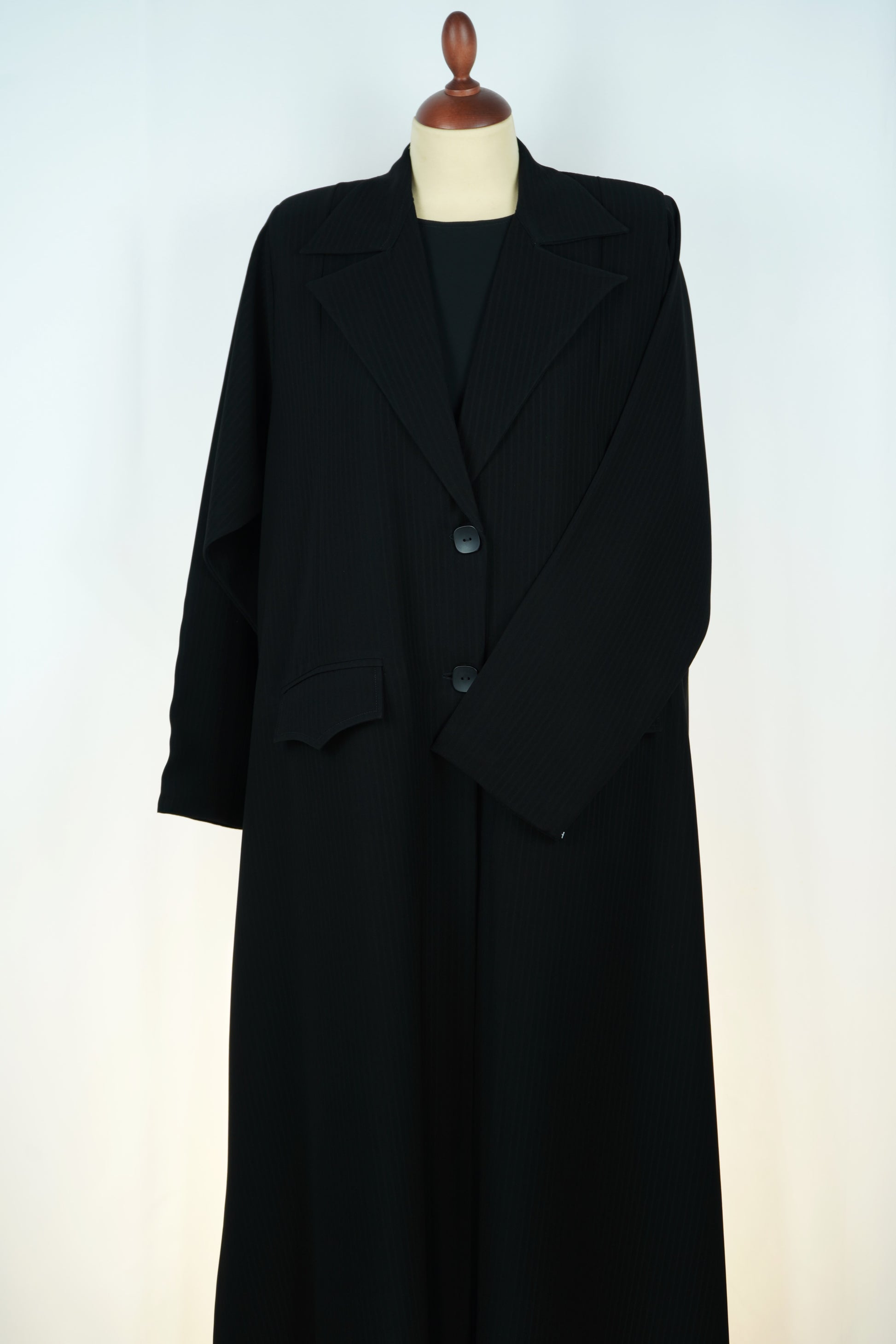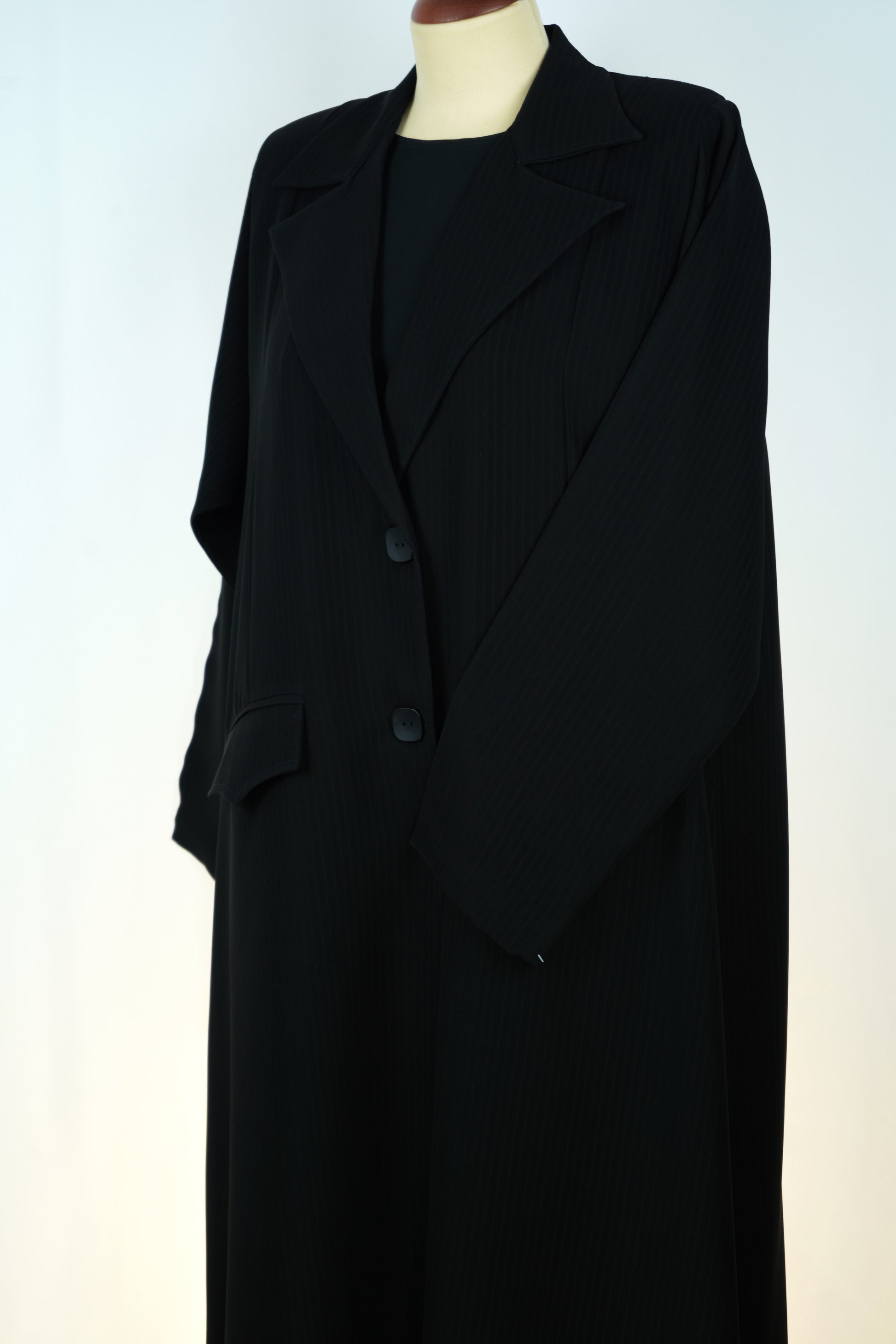 عباءة سوداء بتصميم بليزر أنيق، تتميز بقصة مستقيمة وخياطة متطورة تمنحها مظهراً رسمياً فاخراً يناسب المرأة العصرية.